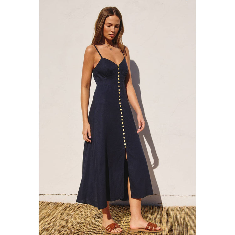 FD11471-P1465 Thin strap V neck dress with center button detail and slit at the hem. Model with NAVY is 5'5", with IVORY, IBIZA GREEN is 5'10", with VINEYARD is 5'7" and in RED ROUGE is 5'7.5". They are wearing size Small. - V neck - Bust detail - Princess line - Thin straps - A-line silhouette - Front center button detail with a slit - Hidden side zipper closure - Lined on the smocking panel on the back,